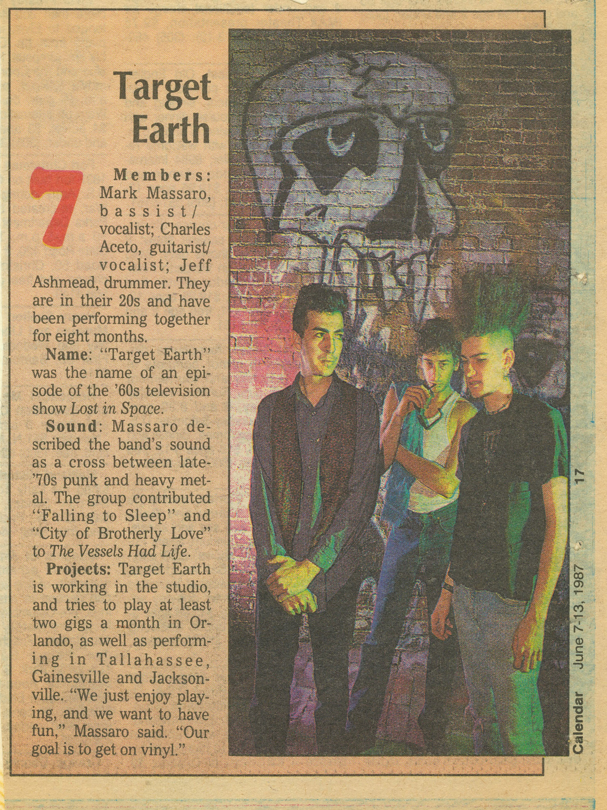 Target Earth was formed out of the ashes of East Egg and The Cloth, in Orlando, Florida, in the spring of 1986 by Charles Aceto and Mark Massaro. Initially, Mark and Charles were going to form two separate bands; Mark, a heavy goth band; and Charles, a heavy rock band. Charles hired drummer Rick Thomas, and after an awkward gig with a drum machine at Below Zero, Mark and Charles decided to join forces, and bring Mark’s heavy goth vibe in to form Target Earth.